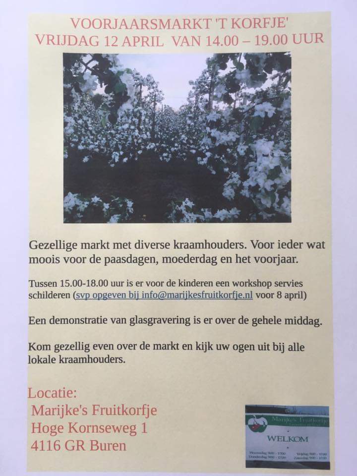 Op vrijdag 12 april is er een voorjaarsmarkt bij Marijkes fruitkorfje in Buren. Hier staat Wereldwinkel Geldermalsen ook met een kraam, met leuke artikelen voor de paasdagen, moederdag en het voorjaar.