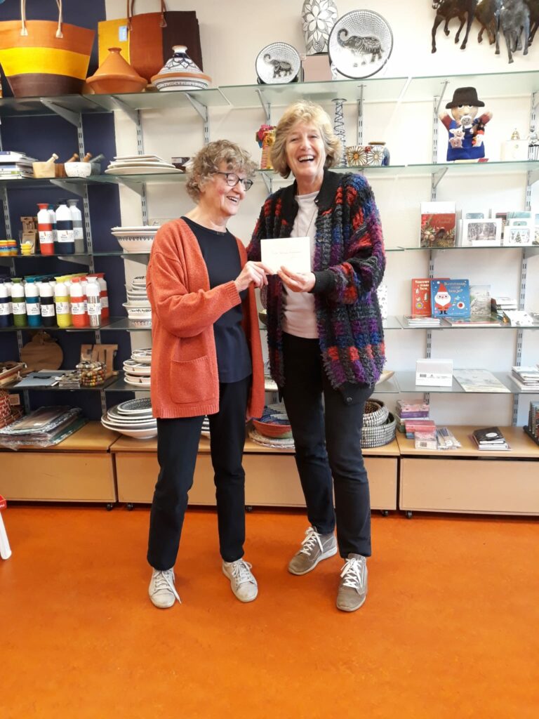 De cadeaubon werd uitgereikt door Anke, die al 30 jaar vrijwilligster, bij de Wereldwinkel Geldermalsen is.